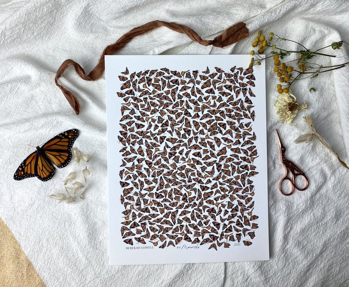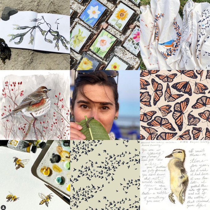 Here’s my #artvsartist2021! This year I made lots of stuff— new patterns, towels, framed minis, I nature-journaled, and (not shown) created art for my novel and picture book! Oh and I raised 415 monarchs, so that’s why I have a caterpillar on my nose. #bestnine2021 #kidlitart