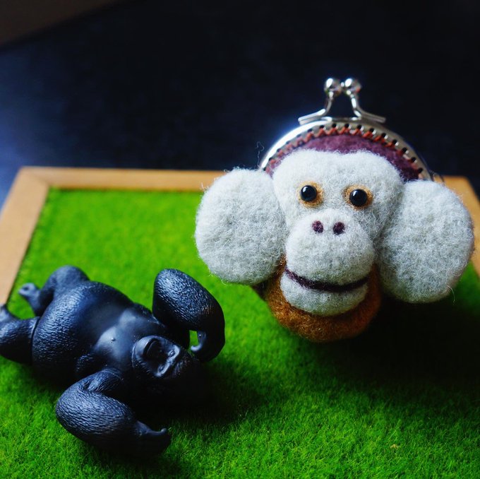 #羊毛フェルト で作ったがま口👛 10つ目の作品は 森の賢者こと #オランウータン です 2日前の8月19日は #世界オランウータンの日🦧 ちなみにフランジ(頬だこ)という 顔のヒダヒダは オスの強さの象徴らしいです✨ ジャングルブックのキングルーイの 大きさが1番びっくりしました😳笑