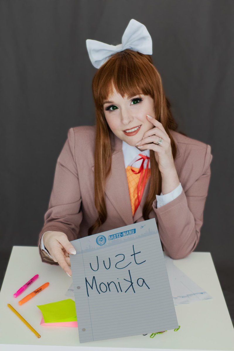 "This is just some kind of tacky romance game, right?" 📸: @itsnicolebeetv & @ReginaMarieCos #ddlc #ddlcmonika #justmonika #cosplay #cosplayphotography