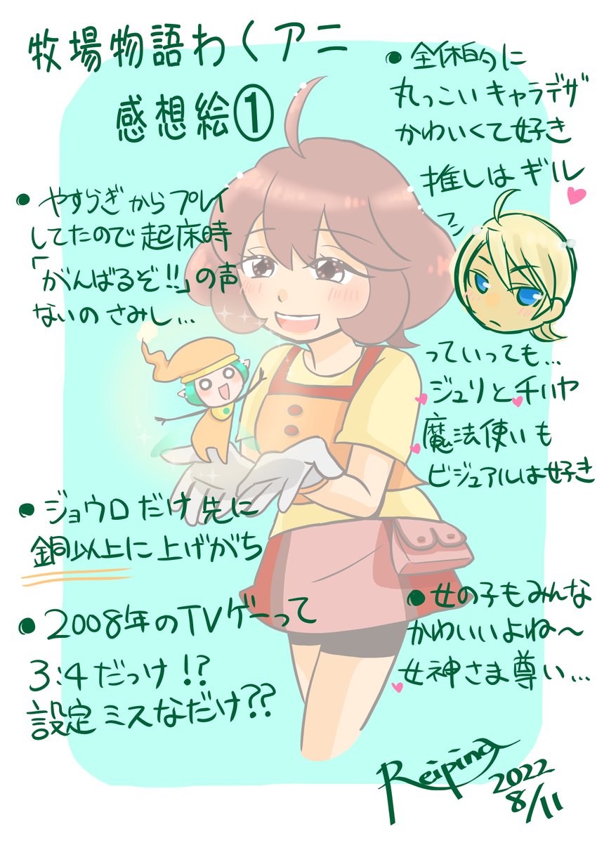 10 58 ぼくものわくアニ プレイ感想絵 また文字を詰め込みすぎた(笑) 服の影や装飾サボったの お許しを…😅 #牧場物語 #わくアニ #イラスト 22/09/26 22:58