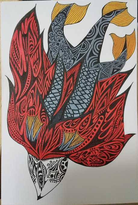 0 2 他の絵(一応ご依頼絵なので画像は載せられない)も進めつつアマビエさんもちょっと進んだ。模様として文字を入れるのが今の私の絵のスタイルになってる。楽しい。 そんで空いていた右側が埋まってきてて嬉しい。 明日もやるぞー。完成させたい! #ペン画 #アマビエ 20/05/30 00:29