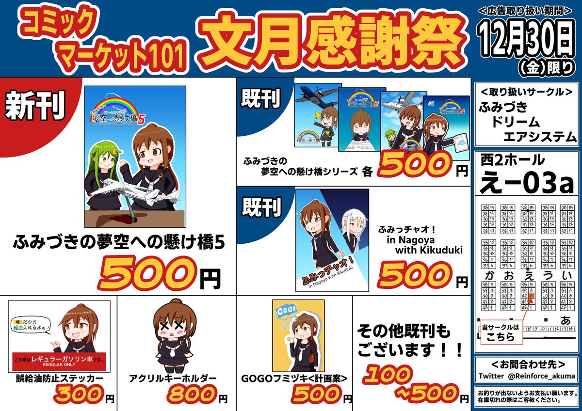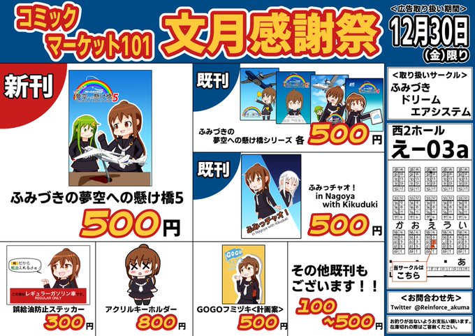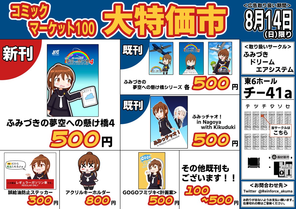 あなたのサークル「ふみづきドリームエアシステム」は、コミックマーケット100で「日曜日東地区 "チ " 41a」に配置されました!コミケWebカタログにてスペース配置場所公開中です! webcatalog.circle.ms/Circle/Map/162… #C100WebCatalog いつもの文月×航空会社の本を描きたいと思ってます。当日はよろしくね。