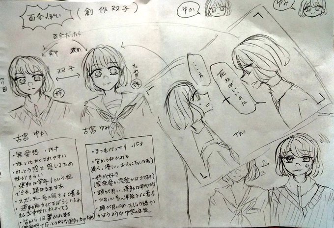 #落書き #絵描きさんと繋がりたい #イラスト #イラスト好きさんと繋がりたい 創作双子描きました! (※字汚すぎて読めない) 2枚目は双子の妹の方です(ゆみちゃん)