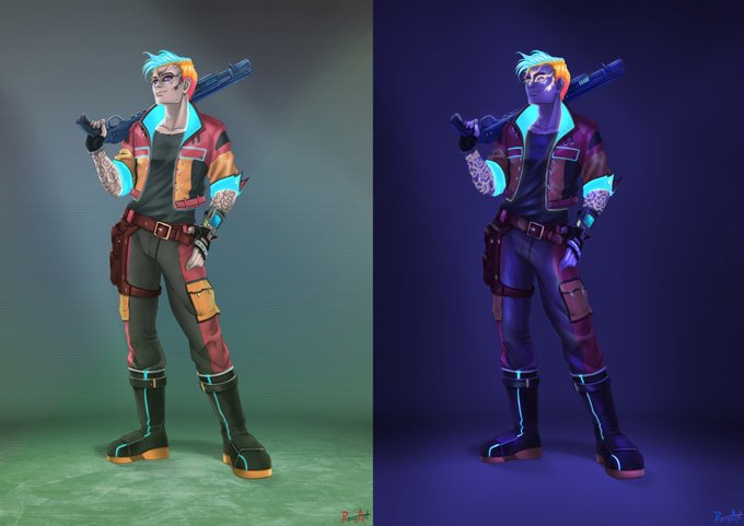 Here's Ravetech! A vibrant OC for a Cyberpunk Red RPG campaign + black light variant. Commission for @XavierTheAlpha --- #illustration #digitalart #cyberpunk #cyberpunkrpg #ttrpg #characterdesign #characterconcept #punk #commission #commissionsopen #artpost #artistsontwitter
