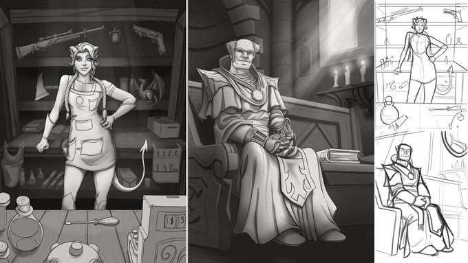 "Hello stranger, what're you buying? What're you selling?" A couple of works in progress this Friday! D&D based commissions. I'm currently working on the "end of the story" of each character from this party. #illustration #fantasyart #DnD #dndart #DnDcharacter #commissionsopen