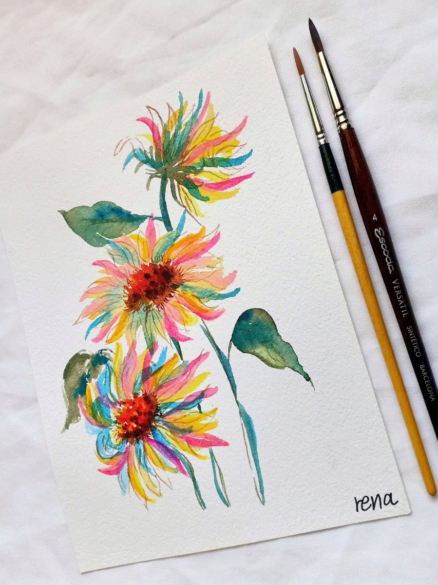 Have you ever seen so colorful sunflowers?🌻 They came to my mind so I've just painted them. Check out my IG page instagram.com/renapaintslove for more flower paintings 🌺 Message me for original art & prints for sale. #floralart #sunflowers #artforsale #watercolorpainting #doodleart