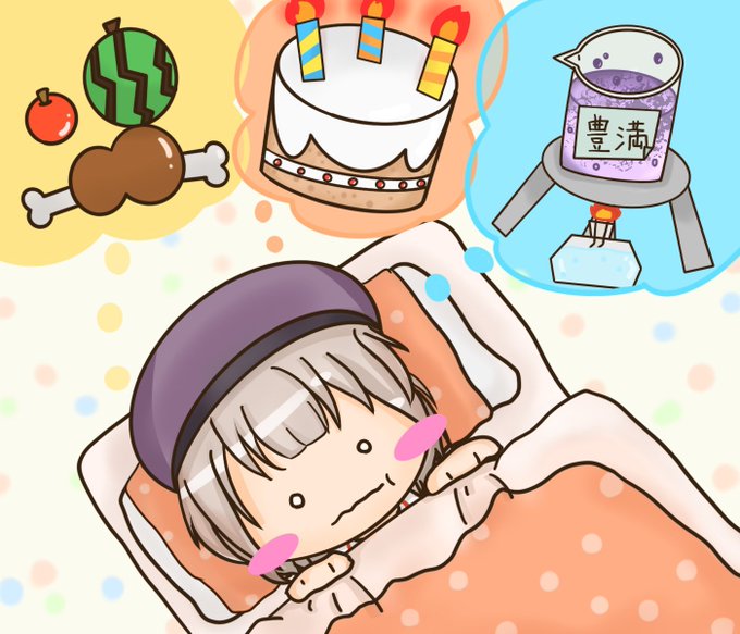 16 52 今日はポリン師匠の誕生日!! 誕生日にご馳走と錬金成果を楽しみにして寝付けないポリン描きました(。・・。) #あいミス #ポリン #ポリン生誕祭2022 22/06/23 10:46