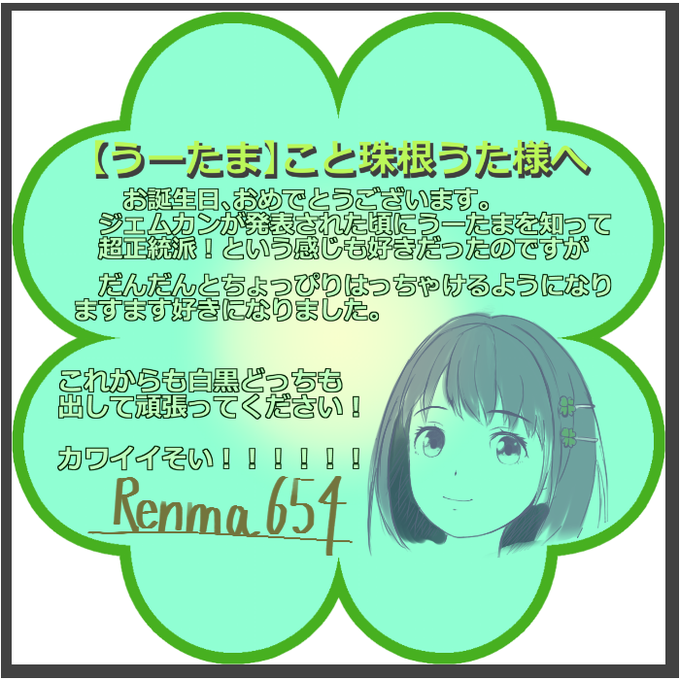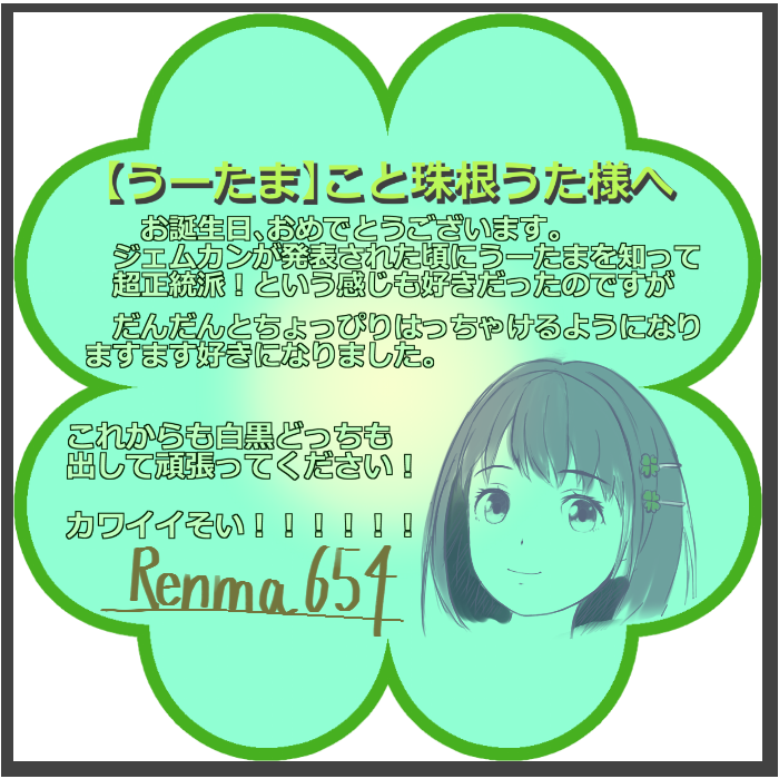 お誕生日&復帰おめでとうございますー! 待ちにまったという感じですが 今後も少しづつ、お身体に気を付けて がんばってくださいませー そい!!!!🍀 ※画像は去年の誕生日のもの。 ※早いものであれから一年……感慨深い #珠根うたそい誕祭2020 #珠根うた生誕祭2020