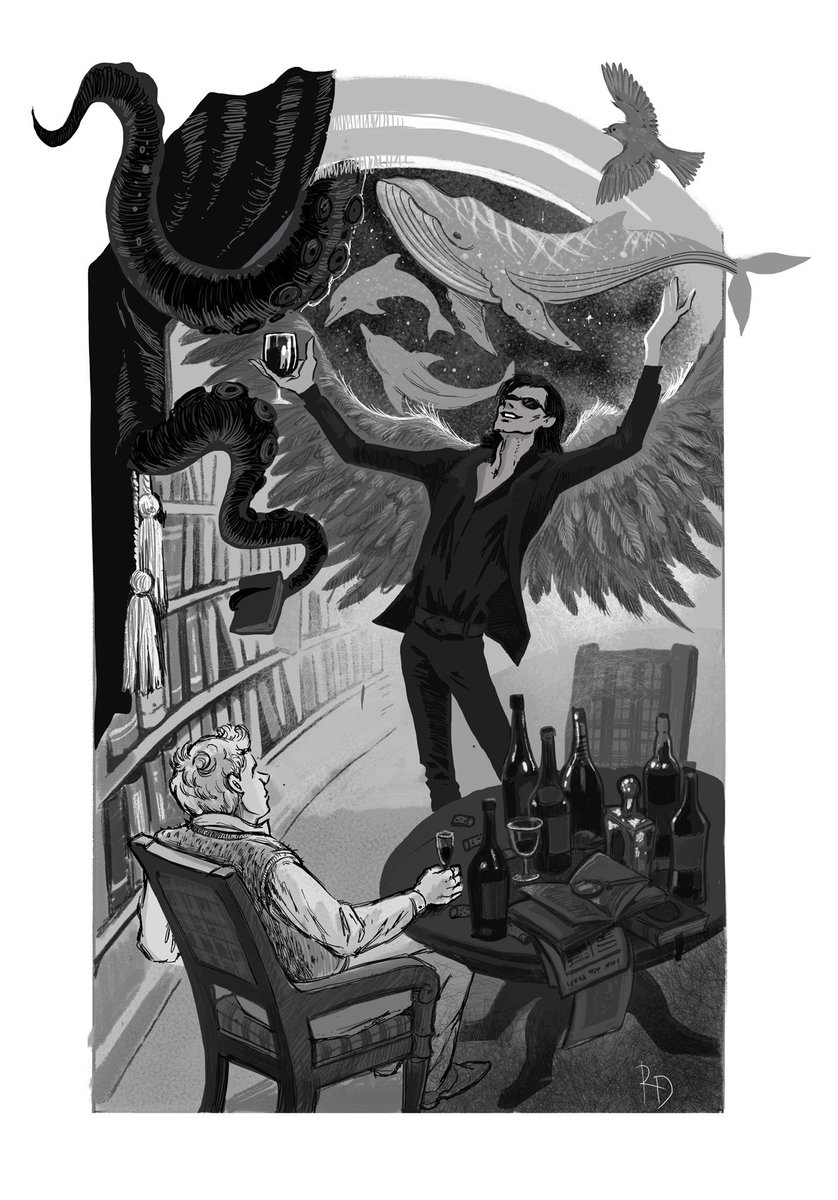 My personal illustrative #inktober based on the novel "Good Omens" by @neilhimself and @terryandrob. Not a real book, just my fan project. Thanks for the great story, I'm in love! Part 2 #GoodOmens #GoodOmensbook #innefable #crowley #aziraphale #illustration