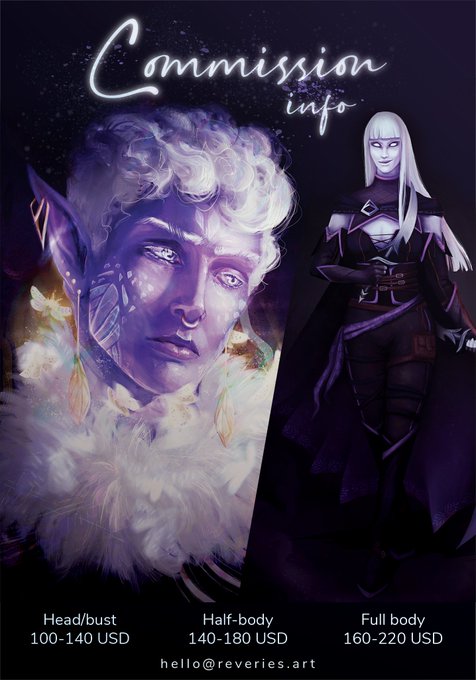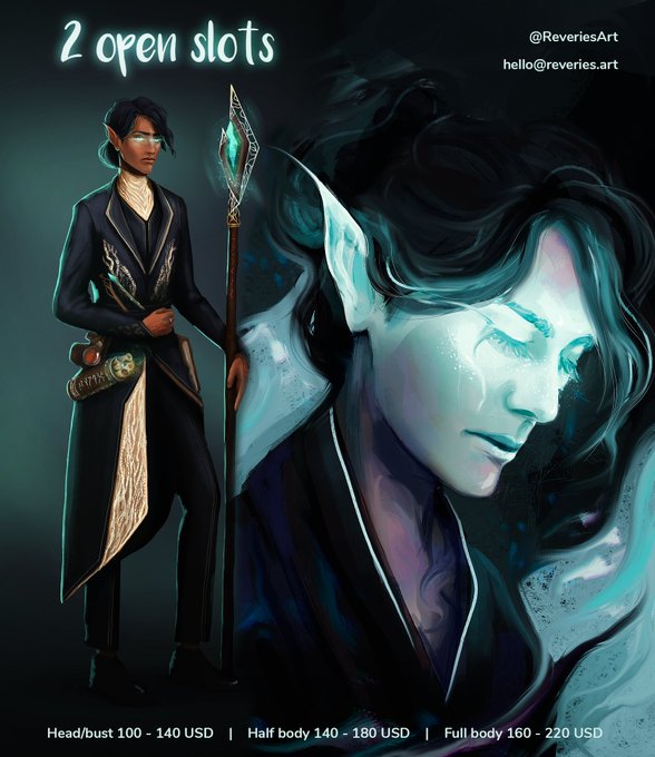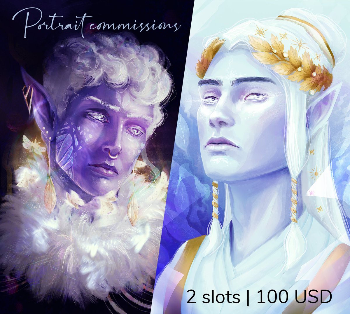I have 2 slots for portrait commissions open! For 100 USD, head/bust with simple background. DM or email me for more info! ✉ hello@reveries.art #dnd #dndart #Commission #CommissionSheet