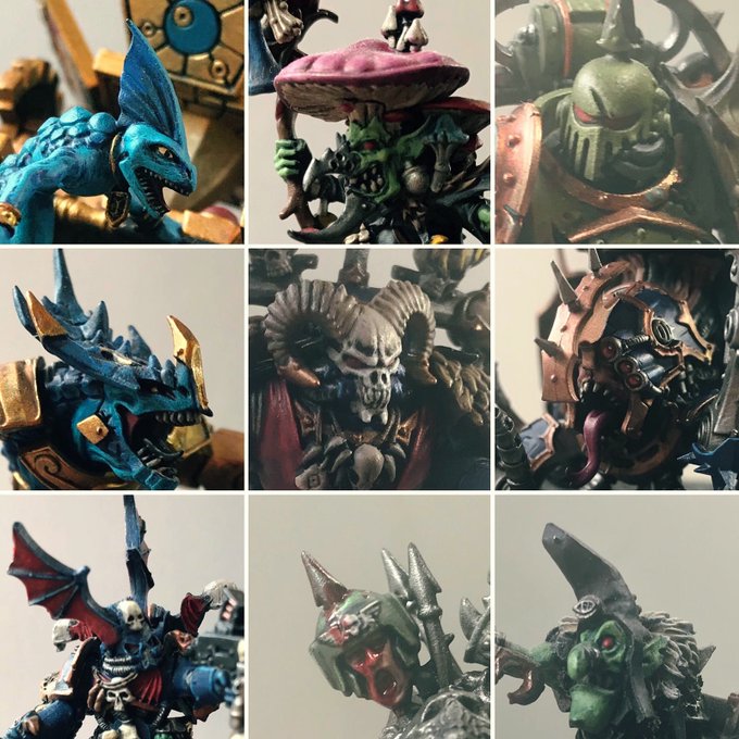 We're jumping on the Face your Art wagon; starting with John's Warhammer collection. (l-r) Skink, Goblin Shaman, Plague Marine Saurus Warrior, Chaos Master of Possession, Venomcrawler Bottom: Chaos Lord, Dead Imperial Dog, Night Goblin Big Boss Stay tuned for more! #faceyourart