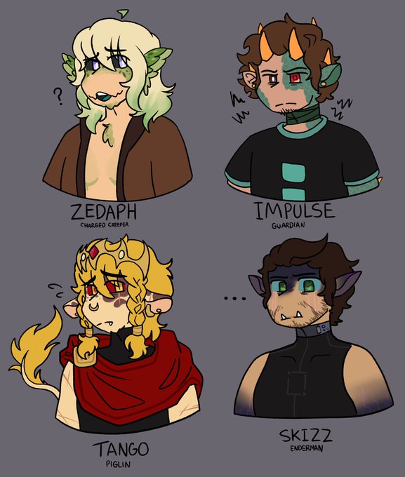 So back when I was more of a Hermitcraft artist I had a fuckin BANGER au called Mind Games,so I'm redesigning shit to one day revive it So uh have team ZITS! They're mob hybrids (they weren't born hybrids heheheh-) #hermitcraftau #hermittwt #teamzits #Hermitcraftfanart
