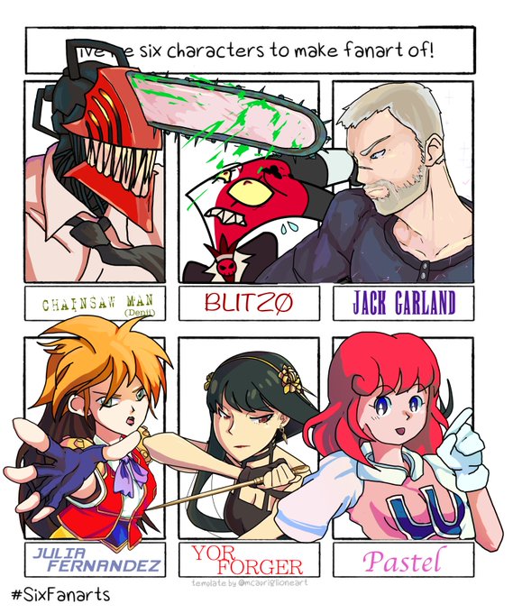 Finished my #SixFanarts Challenge 1. Denji (as Chainsaw Man) for @XtremerSadiq 2. Blitzø from Helluva Boss 3. Jack Garland from SoPFFO for @Shirojyuu 4. Julia Fernandez for @JUSTICE_RIP1231 5. Yor Forger for @GustavoMarcha19 6. Pastel from Twinbee for @TeaTime_94