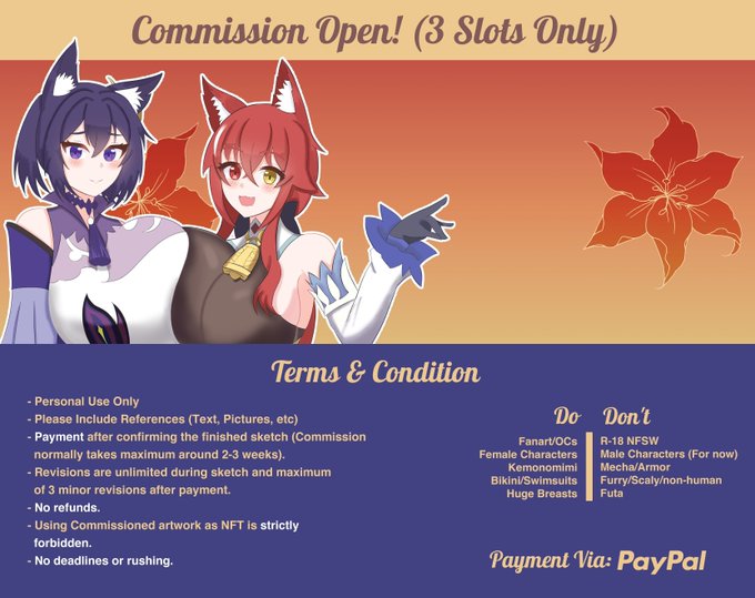 Opening again for 2 slots There will be a price increase for next month's batch so hop in while you can! Retweet and Share always appreciated! #commissionsopen #commissions #illustration #digitalart #Artcommission #animecommission #opencommission