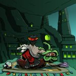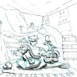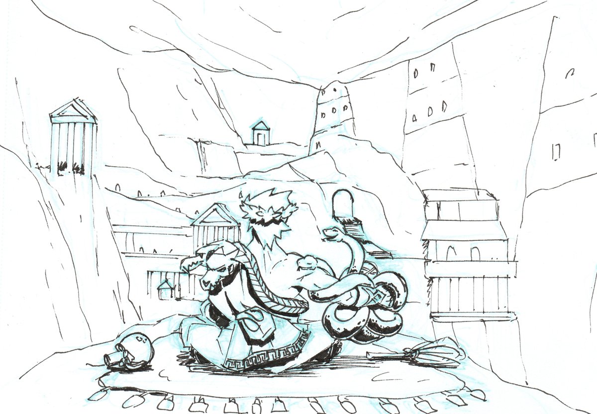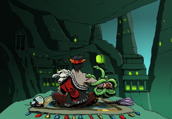 Gone off-piste with today's #inktober because I couldn't get this image out of my head. #Zagreus and #Dusa (who is _obviously_ the best) from #HadesGame enjoying a quiet night in Tartarus. #inktober2020