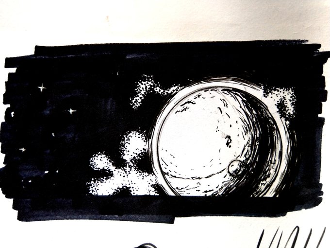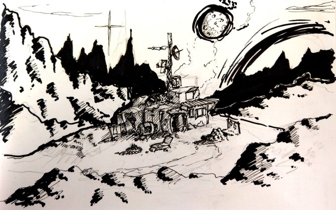 Today's #inktober theme is "Dune" so _naturally_ I immediately thought of Westwood Studio's Dune 2 (like you do). Here's the iconic Arrakis shot from the game's intro. Tried out a few different techniques here. #inktober2020 #retrogaming