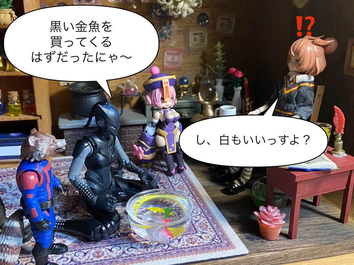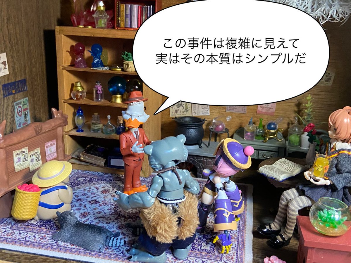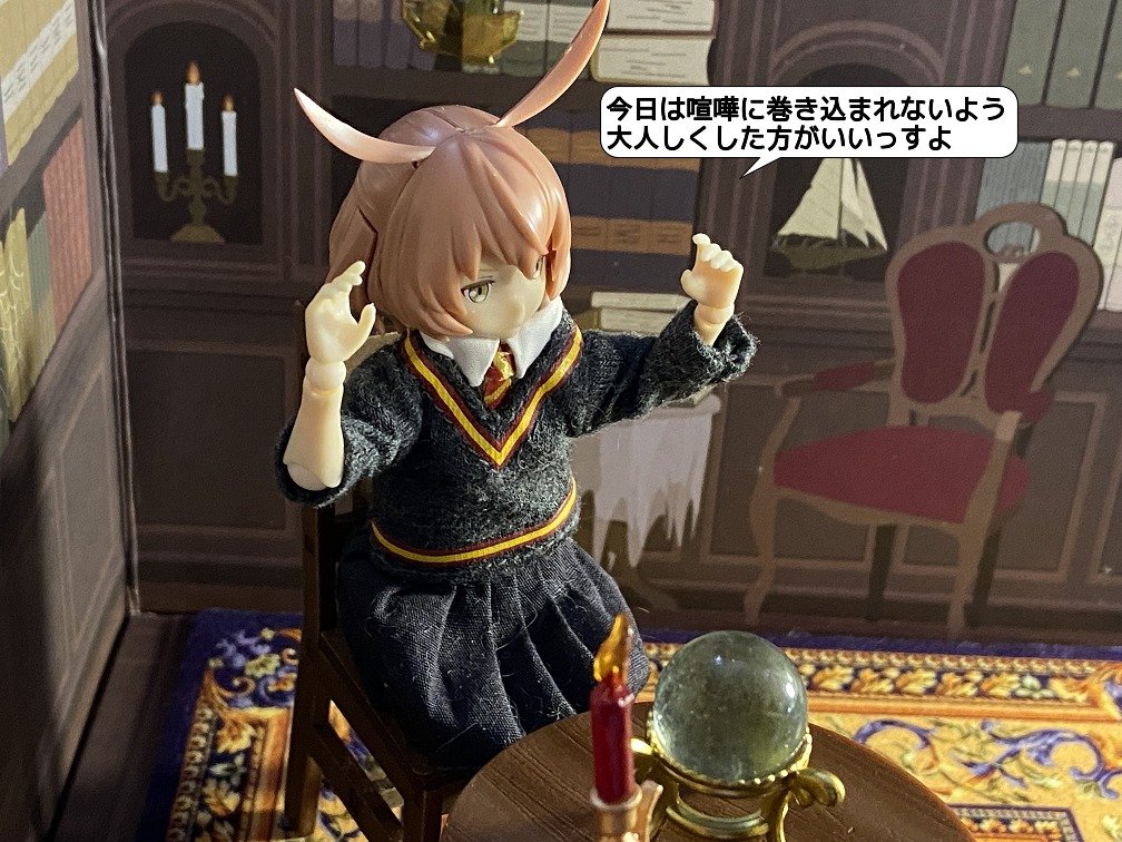 7/20 テーマ「占」 「争いの相が出てるっすね」 「なんじゃそりゃ?」 「今日は喧嘩に巻き込まれないよう 大人しくした方がいいっすよ」 「(……ラプ子の占い当たったなぁ……)」 #おもちゃ撮影会