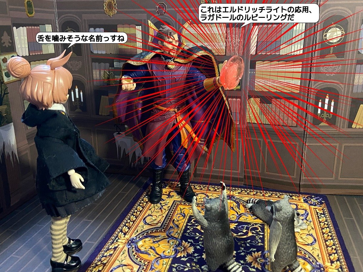 10/18(月)テーマ「魔法」 「これはエルドリッチライトの応用、 ラガドールのルビーリングだ」 「舌を噛みそうな名前っすね」 「うーん……? 小さい」 「まぁ、おいおい慣れてゆけばいいさ」 「そ、そうっすね」 「できたのだ!!」 「マジっすか!?」 「信じられんな……」 #おもちゃ撮影会