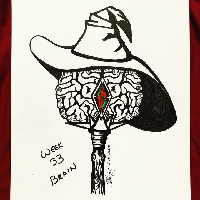 A #necromancer animated their brain on their staff to die of their own will and ensure immortality. Also they love their hat. The #bloodstone holds the enchantment. Sad its been decades since I played #dnd 😓 #inktober52 #inktober #inktober2020 #brainart #creepy #necromancerstaff