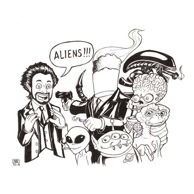 #InktoberReboot Day 29 #CigaretteSmokingMan from #XFiles protecting his secrets against the tenacious #GiorgioTsoukalos . #inktober2019 #inktober #RiggerArt #Alien #toystoryalien #ET #greyalien #smoking #MarsAttacks #imnotsayingitsaliens #Drawing #Ink #Art #ArtistOnTwitter