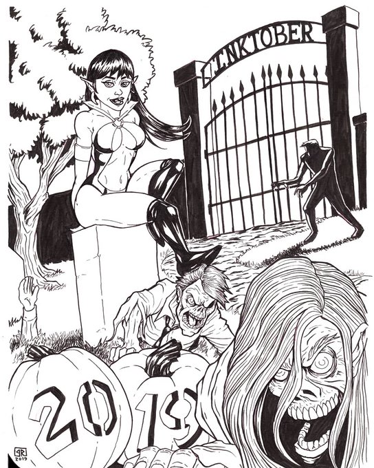#InktoberReboot Day 31 is #Vampirella . That's a wrap on #inktober2019 . I hope you guys enjoyed it. Happy #Halloween everybody!!! #Inktober #RiggerArt #Vampire #Zombie #Graveyard #Comics #comicbooks #Comicbookart #Fanart #Drawing #Ink #Art #ArtistOnTwitter