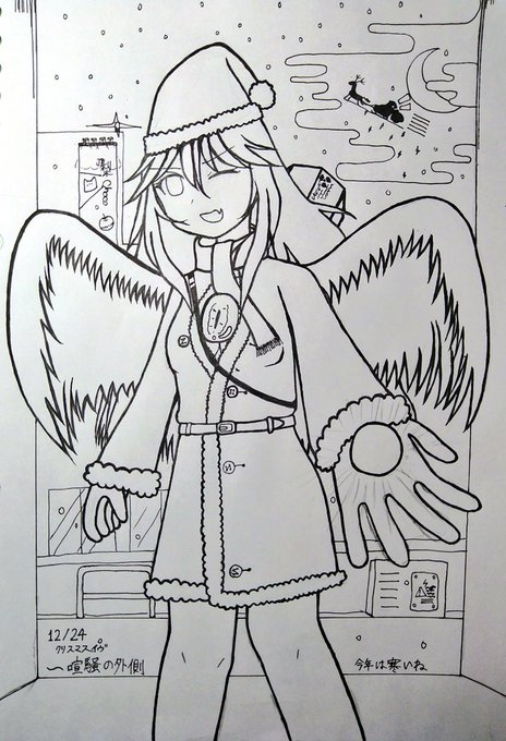 1 7 #霊烏路空 #お空 #クリスマス #東方Project #イラスト #イラスト練習中 #アナログ 色まで行けるか……?今までで1番時間かかった(線を太くした所為) クリスマスお空 「ここにいると寒いでしょ、ほらこれ使って暖まって!」 22/12/25 00:55