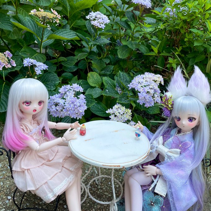 15 165 紫陽花の木陰で、お茶を楽しむ2人😊 #RonshukaCouture #MIEL服 #ナナイロテントウ #うちのこかわいい #MDDはいいぞ 22/06/21 12:30