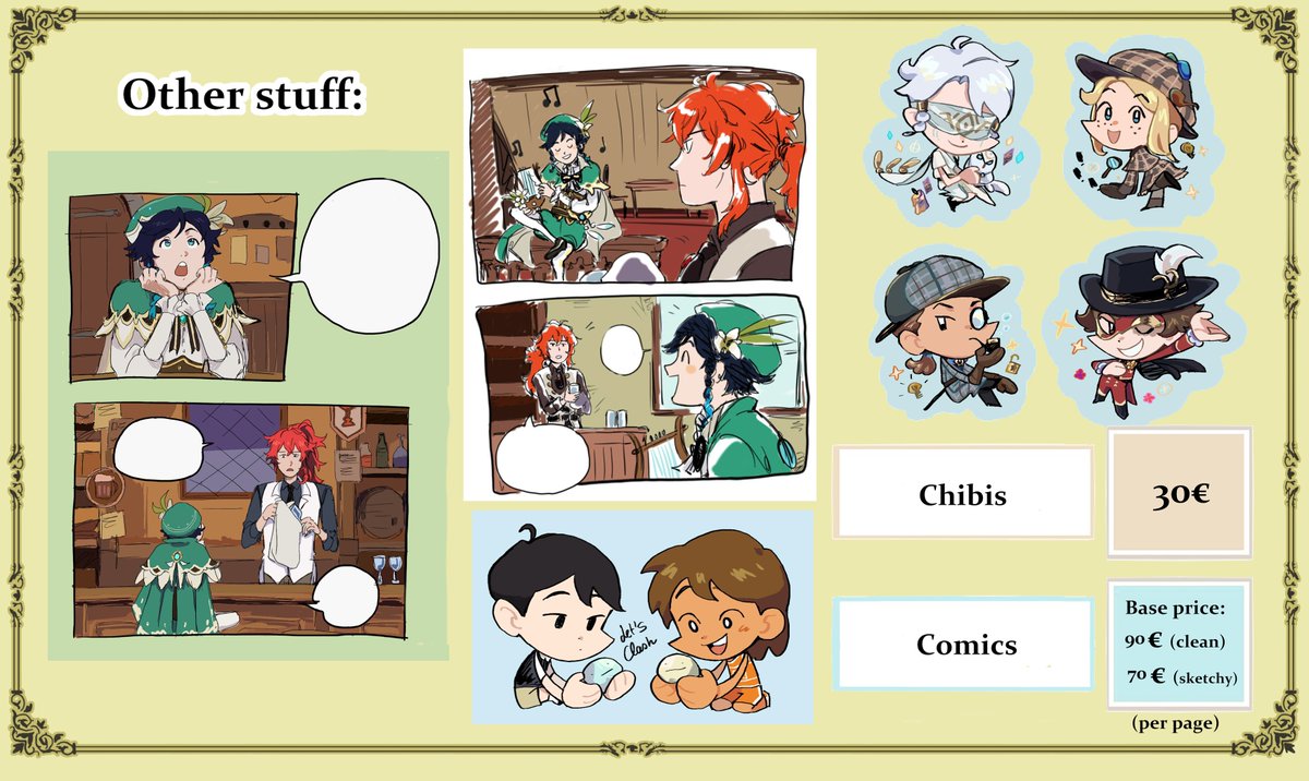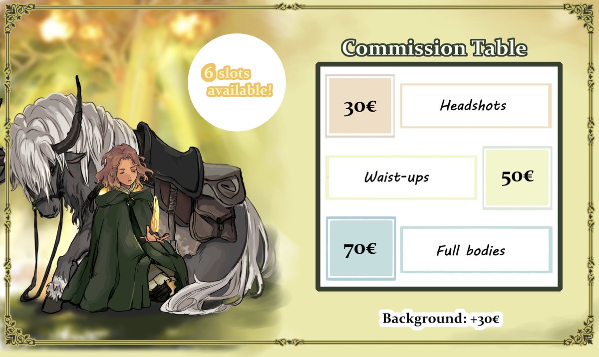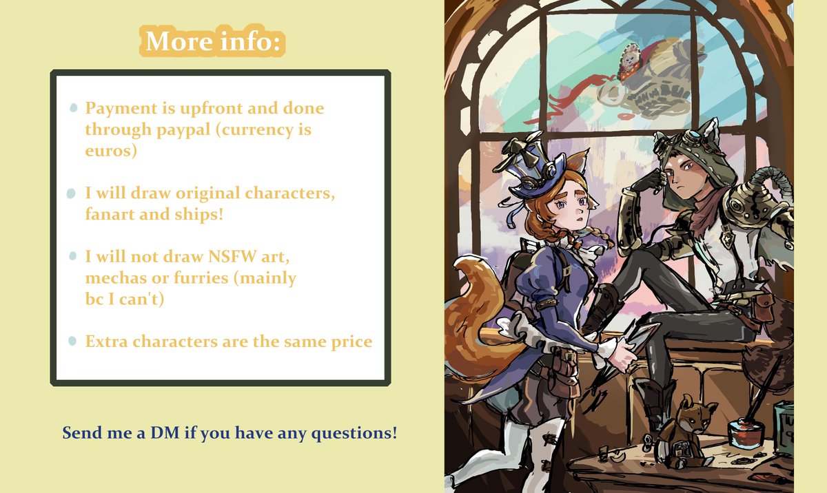Hi! I finally got some free time to draw so I'm opening some commission slots! 🔅If you are interested, please contact me through direct message! You can find more samples for my art in my twitter gallery. Sharing the post is very appreciated 🥹💕Thank you!