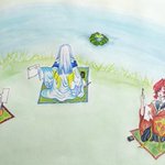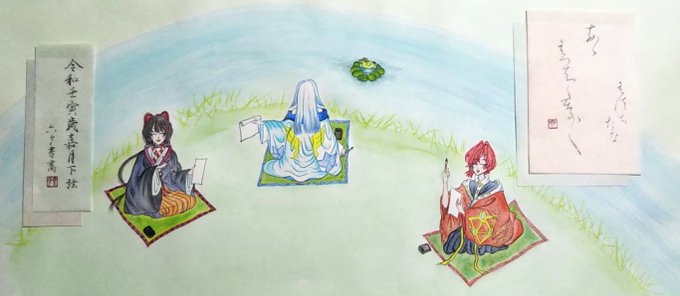 遅刻ですが、やっと描き終わりました…しかも下書きで描いた方が良かったかもしれなくて(右の方ですが)感謝の気持ちはたくさん込めました! 3周年おめでとうございます! 曲水の宴から着想しました✨ #さんばか3周年 #絵ンジュ #ヘル絵スタ #いぬいらすと