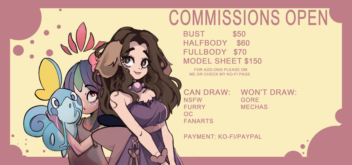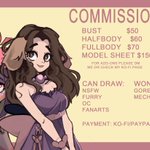 need to pay some house bills and to help momma to pay her things, so i did a pretty neat commission sheet -w- if you're interested pls dm me on both discord(Rilo#7477) or twitter. RTs are appreciated! tysm -w-