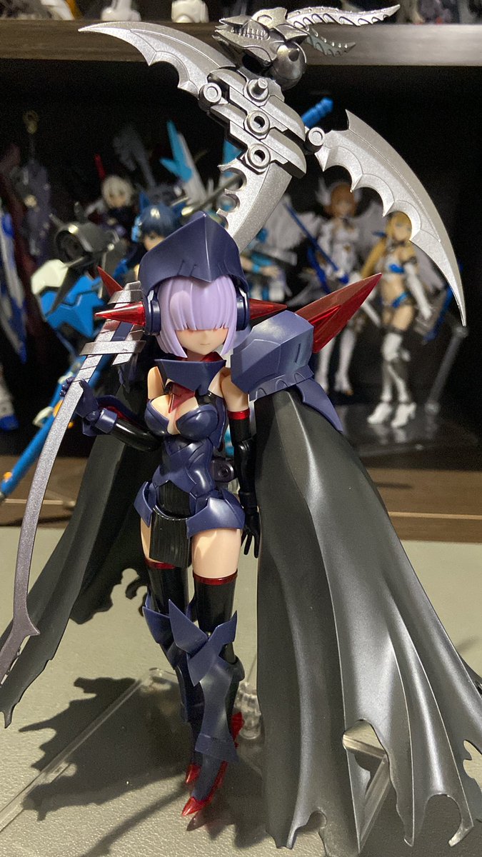 大鎌だけライトガンメタルでスプレー塗装 金属感があってすこ マントの接続は説明書通りではなくエクスキューショナーbrideのを採用 入ってるランナー一緒だからできるね しいたけ目もすこだけど目隠れもすこ #メガミデバイス
