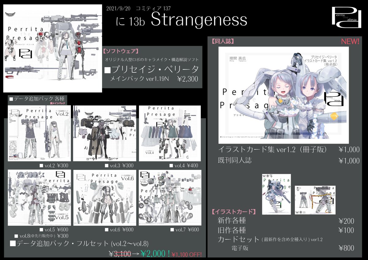 【イベント直前告知】明日9/19(月)青梅展示棟で開催される #コミティア137 に参加します。 に13b”Strengeness” です。 新規頒布物として、同人誌『#プリセイジペリータ イラストカード集ver1.2(冊子版)』を頒布します。 その他『ペリータ』のDLカード、既刊誌等々も頒布しますのでぜひ! #pre_perrita