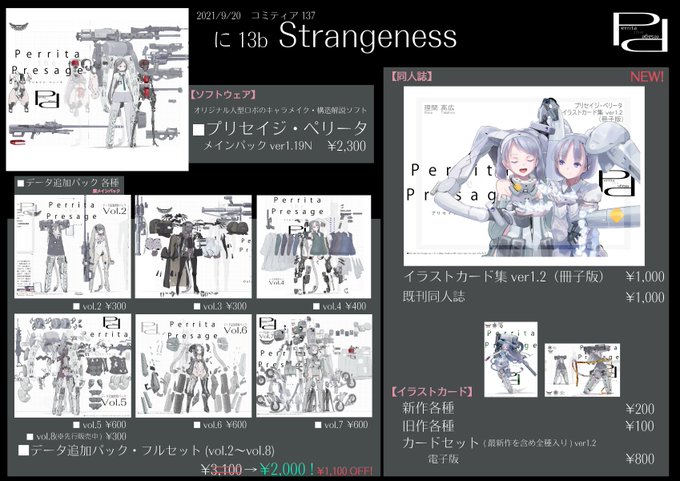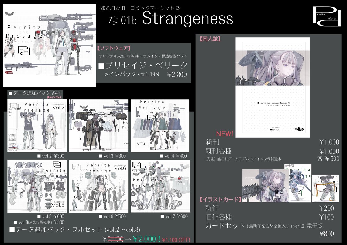 【直前告知】12/31 #コミックマーケット99 二日目に参加します。 西1ホール な01b Strangeness です。久方ぶりの同人誌新刊のほか、イラストカード各種、オリジナル人型機械のキャラメイク・設定閲覧ソフト『 #プリセイジ・ペリータ 』+データ追加パック各種、等々を頒布予定です! #pre_perrita #C99