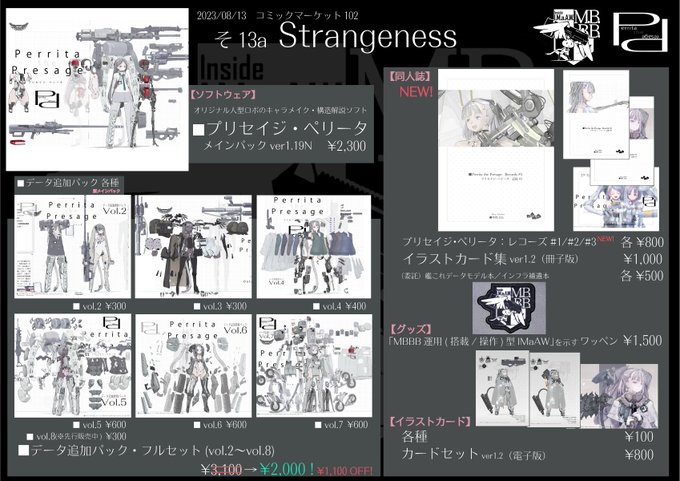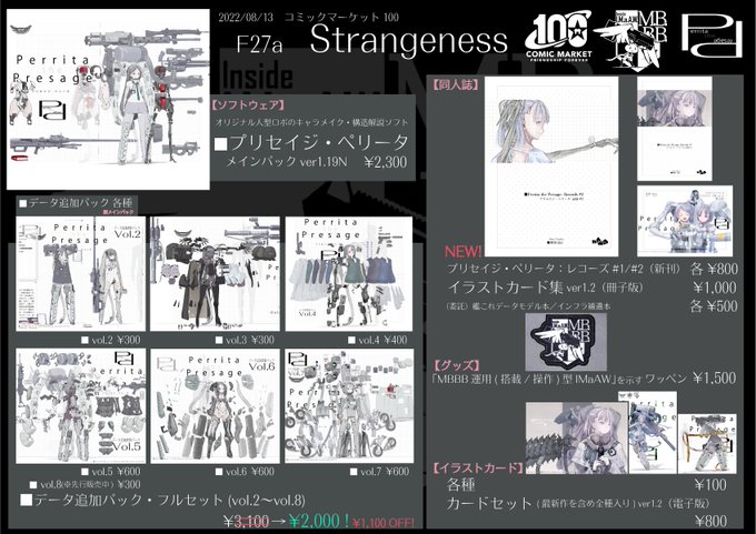 【直前告知】08/13(土) #コミックマーケット100 1日目に参加します。 東1 F27a Strangeness です。 新刊・既刊同人誌のほか、オリジナル人型機械のキャラメイク・設定閲覧ソフト『 #プリセイジ・ペリータ 』+データ追加パック各種、作中世界のロゴワッペン、イラストカード等々を頒布予定です! #C100