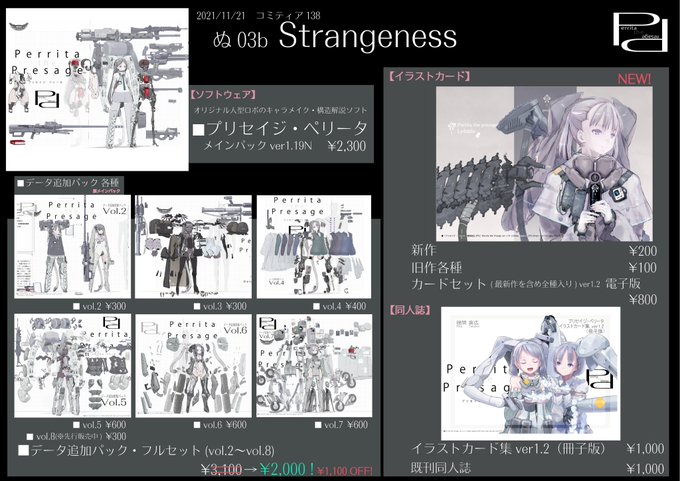 【直前告知】明日11/21のCOMITIA138に参加します。 ぬ03b Strangeness です。新作イラストカードのほか、オリジナル人型ロボのキャラメイク・設定閲覧ソフト『プリセイジ・ペリータ』のDLカード各種等の頒布を予定しています! #pre_perrita #プリセイジ・ペリータ #コミティア138 #COMITIA138