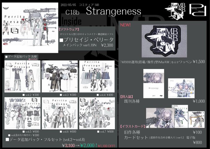 【直前告知】明日02/20(日)にビッグサイトで開催される、#コミティア139 に参加します。 東4ホール B16b"Strangeness" です。 オリジナル人型機械のキャラメイク・設定閲覧ソフト『 #プリセイジ・ペリータ 』とそのデータ追加パック各種、関連同人誌やイラストカード等々を頒布します! #pre_perrita