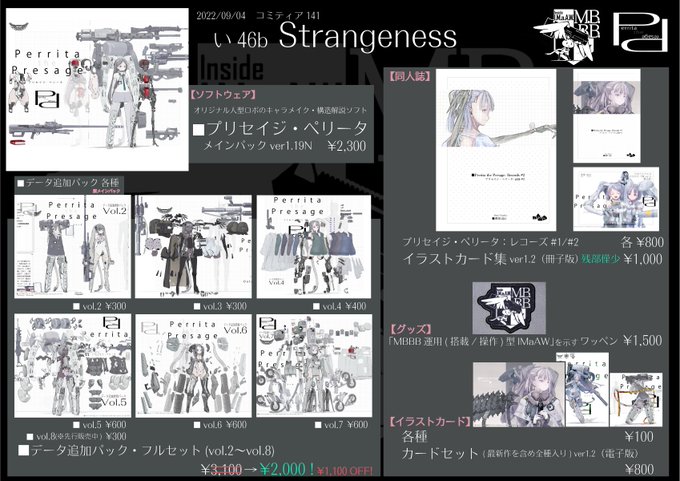 【直前告知】明日2022/11/27(日)ビッグサイトで開催の #コミティア142 に参加します。 か08b”Strengeness” です。 オリジナル人型機械のキャラメイク・設定閲覧ソフト『 #プリセイジ・ペリータ 』+データ追加パック各種、作中世界のロゴワッペン、既刊同人誌各種、イラストカード等々を頒布予定です!