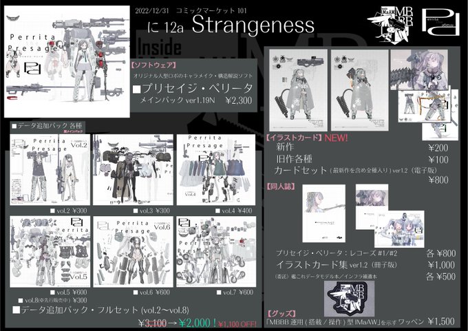 【直前告知】12/31(土) #コミックマーケット101 2日目に参加します。 西1 に12a Strengeness です。 新作イラストカード(2種)、既刊同人誌各種の他、オリジナル人型機械のキャラメイク・設定閲覧ソフト『 #プリセイジ・ペリータ 』+データ追加パック各種、作中世界のロゴワッペン等々を頒布します!