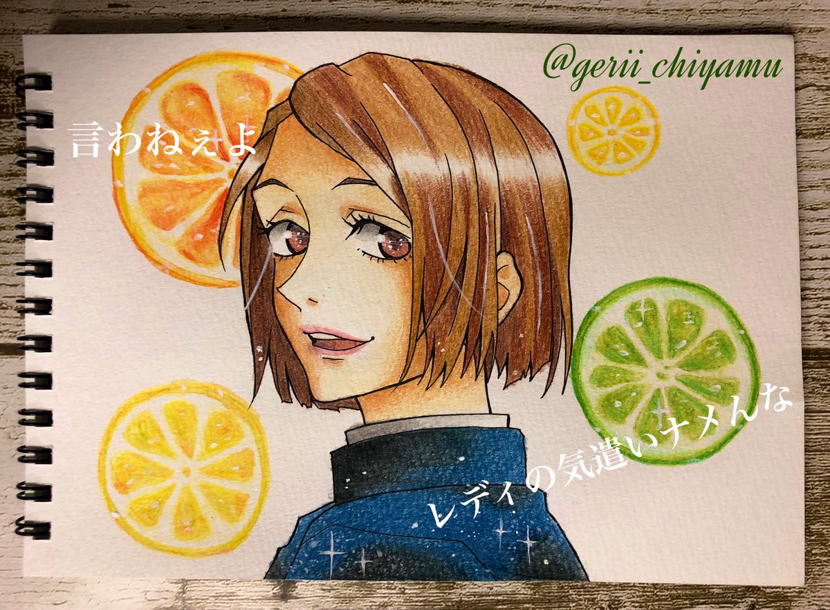 最近どハマりしてます、野薔薇ちゃんに♡柑橘系が似合うなぁと描いてみたかった輪切りを背景に🥰 #釘崎野薔薇 #呪術廻戦イラスト #呪術廻戦ファンアート #呪術廻戦絵描きさんと繋がりたい #野薔薇 #アナログイラスト #色鉛筆画 #ファンアート