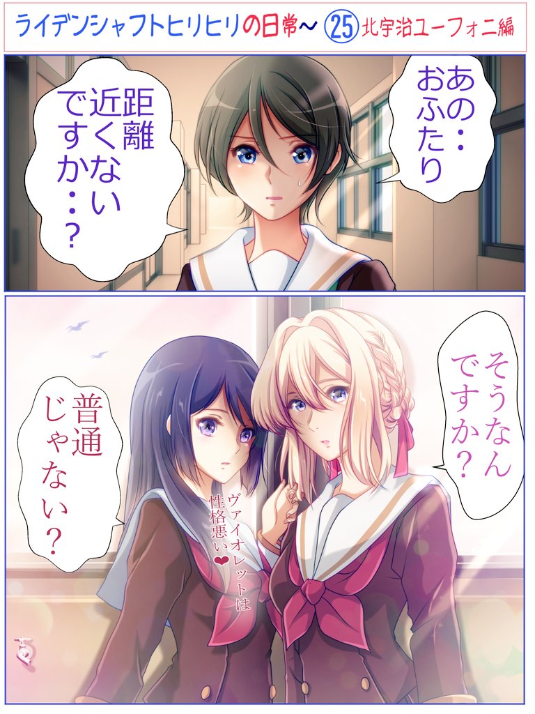 「水色の悪魔のオーラ流石なのです」 「お互い頑張ろうね❤」 「北宇治の実力、見せつけて差し上げるのです‼️」 ごん 「あだっ💦」 「ほ、本番はまだだから( ᐛ ;)」 #イラスト #ヴァイオレット・エヴァーガーデン #響けユーフォニアム #絵師さんフォロバ100