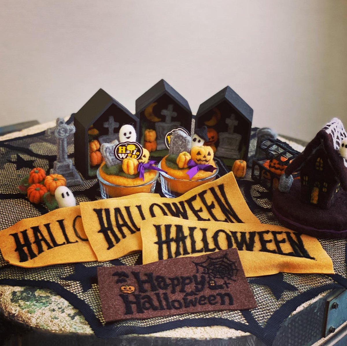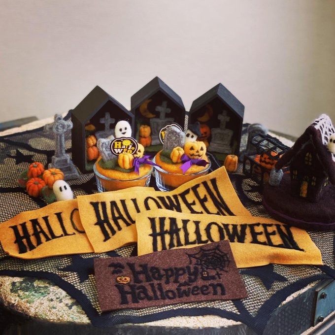 今日の福田りおの羊毛フェルト講座 東急セミナーBE二子玉川校は ハロウィン🎃👻レッスン。 ハロウィンの墓地ジオラマ(笑) かぼちゃプリン🎃 ハロウィンフラッグ、でした✨ #羊毛フェルト #かぼちゃプリン #riofukuda #woolfelting #halloween #lainefeutree #羊毛氈