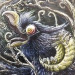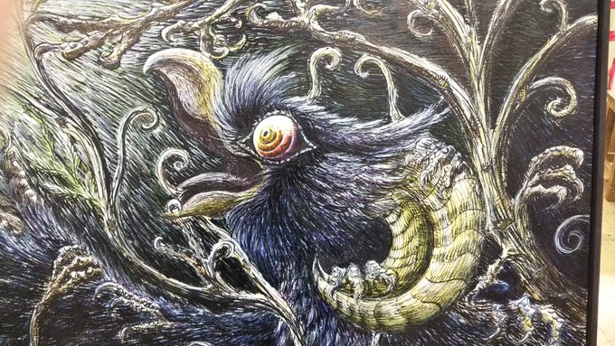 過去絵だけど、前回上手く撮れてなかったので再投稿。 蛾と友達になりたいバケモノ鳥と、 食べられると勘違いした蛾。 それを止めたり、見守ったり、同じことをしようとする枯れ木のバケモノたち。 #中央展 #ペン画 #油絵 #モンスターデザイン #monsterart #creaturedesign