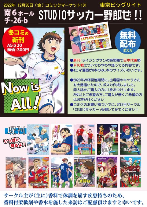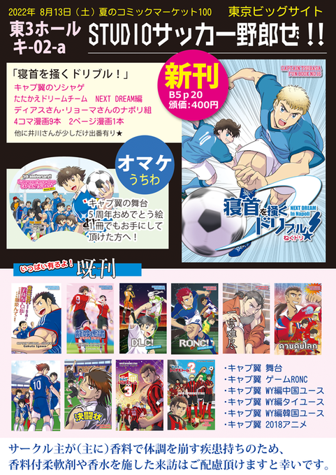 キャプ翼サークルの末席に参加させて頂きます。 「STUDIOサッカー野郎ぜ!!」は、コミックマーケット100で「土曜日東地区 "キ " 02b」に配置されました!webcatalog.circle.ms/Circle/Map/162… #C100WebCatalog 新刊は舞台ではないです…スンマセン
