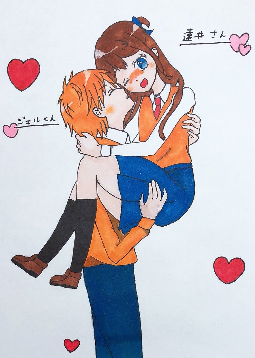 ジェルくん×遠井さん ジ『遠井さん好き🧡』 遠『ちょっ!ジェル降ろしなさいよ//』 こういうの描いてみたかったの 2人の絡み好きw もっとコピックの色集めて、色鮮やかにしたかったな🥺 #すとぷりギャラリー