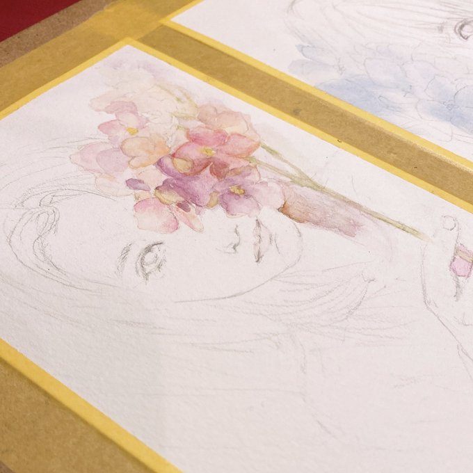 少しずつだけど進んでる… #途中経過 #水彩画 #人物画 #紫陽花 #自分でモチベ上げ
