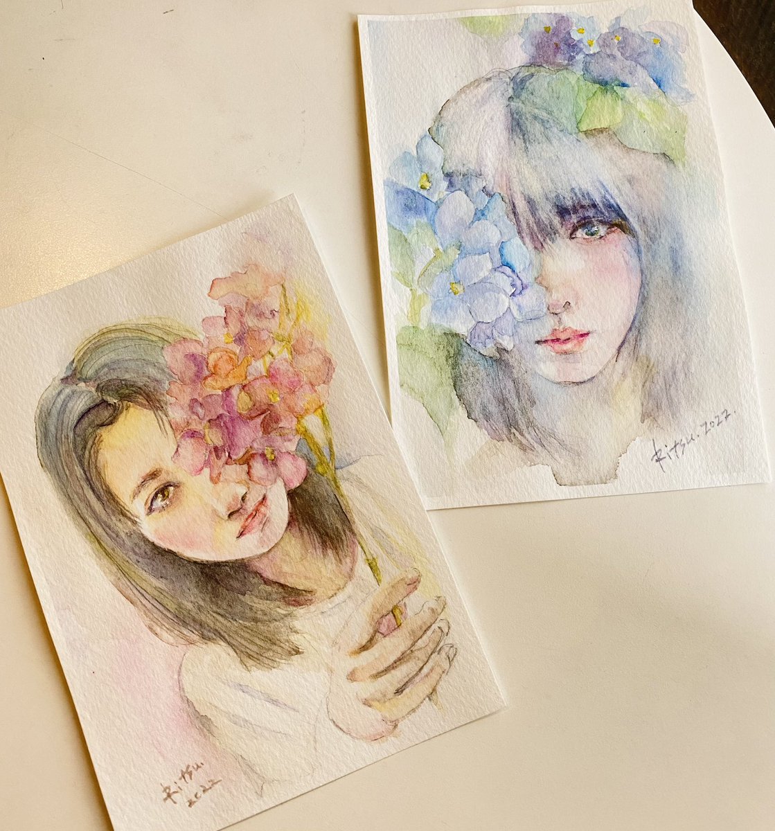 6月最後に🎨🖌 #水彩画 #人物画 #紫陽花 #難しい #練習 #頑張ろ #時間大切