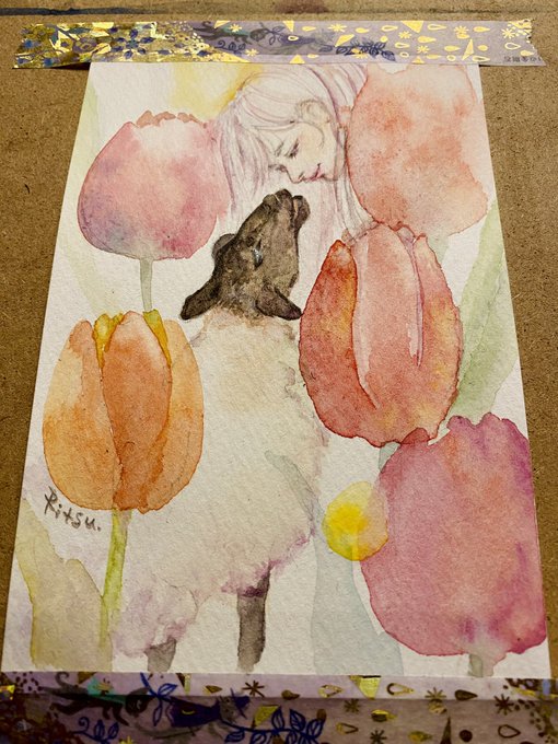 5 53 ひつじも可愛かったなぁ💓 #水彩画 #牧歌の里 #ひつじ #黒顔羊 #チューリップ #癒し #好きに描く 23/05/08 18:07