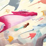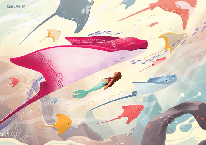 The dance of migrating stingrays, flies freely in the warm ocean, singing tropical songs that Alura the girl with the fishtail loves. She befriends Sorley, a magical fiery pink ray. #mermay #childrenillustration