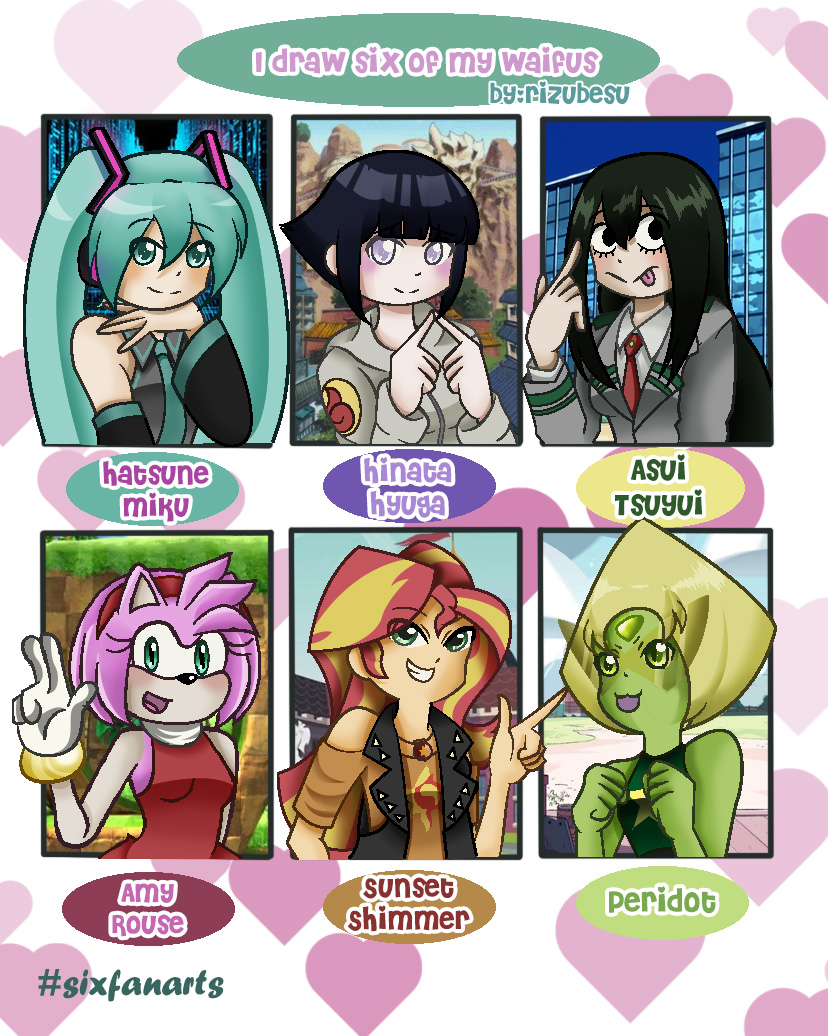 me desidi hacer el #challenge dibujando a mis 6 #waifus favoritas #hatsunemiku #hinatahyuga #tsuyuasui #amyrouse #sunsetshimmer #peridot #sixfanarts