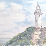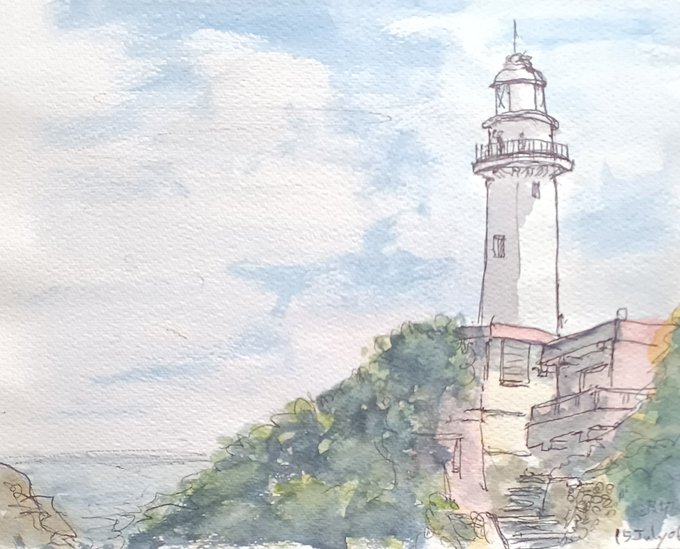 3 15 [灯台] 0258 5.7.11 伊勢湾に浮かぶ九鬼水軍の島 島の三つの港の1つが答志港 #水彩風景画 #答志港内灯台 #エスキース 23/07/11 04:59